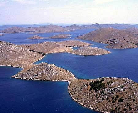 We didn't take this picture, but it's hard to show the Kornati Islands National Park from sea level. Of the 140 Kornati islands, 109 are included in the park. The islands are karst rock, carved by underground water into caves, rivers, sinkholes, and barren, rocky ground. From a distance, the islands look bluish and barren. From close up, the rock is often striated diagonally, or with ridges that look like fallen dominoes, or huge cliffs, or rounded, with growth that looks like a pale green carpet. |