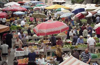 One of our favorite pastimes is to visit the produce markets. This market is in Šibenik, a medium-sized city, but it's very typical of open-air markets in Croatia. The vendors use balancing scales with metal weights to ascertain the number of kilograms. They place the weights on the balance in combinations until they arrive at the amount of your order. Meat and fish sellers are in kiosks and buildings around the market's outside edges. You won't find much produce, bread, meat or fish in most supermarkets in Croatia. People here shop every day for what they need, at specialty shops and open-air markets like this one. |
