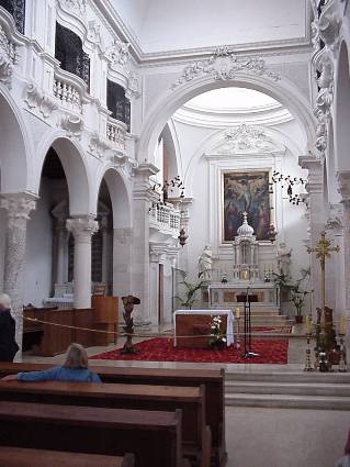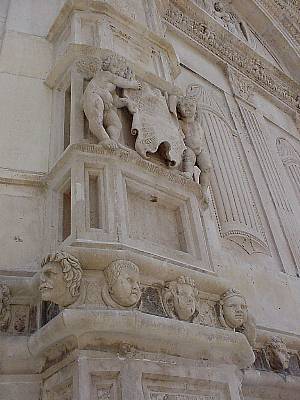 Šibenik's Cathedral of Saint Jacob (Saint James) was begun in 1431. It is built entirely of stone, limestone and marble, and is unusual in that there is no bell-tower. The outside of this cathedral is as intriguing as the inside. This frieze—that goes on for more than seventy heads—immortalizes Renaissance dignitaries and others favored by the architect. The two cherubs above them are holding a document that describes the building and the cathedral's builder. |