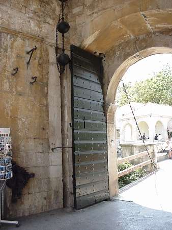 The Pile gate is the outer gate to the city, dating from 1537, and protecting an older inner gate within. The drawbridge (now just a walkway) was lifted each night, the gate was closed, and the key was handed to a prince. We saw the original keys on display at a museum in town. Note the huge iron doors, especially impenetrable from the moat outside, and the complex system by which the drawbridge was raised and lowered. The wheel (next to the postcard stand) hoisted the drawbridge, assisted by the counterweight iron balls hanging by the door. On the exterior side of this gate is a statue of Saint Blaise, set in a niche. Saint Blaise is the patron saint of Dubrovnik, acclaimed all over the city, and the patron saint of the ornate church on the town's main square. |