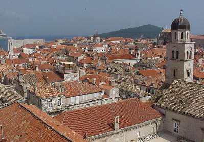 The rooftops of Dubrovnik are a patchwork of old and new tiles, and can be seen at their best from the top of the city walls. Beyond the old town are the harbor and coastal islands of Southern Dalmatia. |