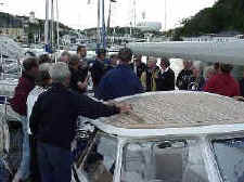 The festivities began with Ankerdram, the traditional drink at the successful completion of a long sail, after the boat is safe in harbor and all the gear is stowed. We had 24 people from a dozen boats aboard Swept Away to toast the event with bitters. Ankerdram can be schnapps or any other short drink, sipped from small shot glasses. |