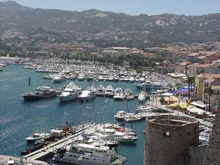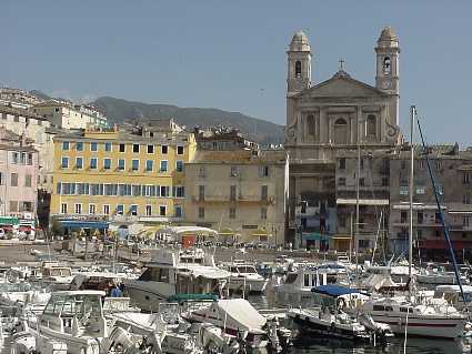 We made landfall at a small village called Macinaggio, so small that we needed to leave on the first bus out of town to replenish our French francs. Macinaggio has no bank and no cash machine for travelers. We went to the city pictured at right, Bastia. Bastia is one of the largest cities in Corsica, and was the capital of the island during the period of Genoese rule from 1347 to 1729. Bastia is the port of arrival for many visitors, and huge ferries enter and exit the port all day long. This is the Vieux Port, or old port, dominated by the Eglise St-Jean-Baptiste, with its two camponiles. |