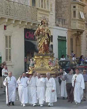 The festa (or festival) is one of the most important events for the many parish churches on the island. The festa attracts both locals and tourists now. The church is often decorated with lights and celebrates with fireworks. Then, the statue of the village patron saint is paraded through the streets on the shoulders of volunteers. The church just down the street from our marina was in the middle of its festa one afternoon when we came back to the boat. Note the gallerija, the built-out, enclosed wooden balcony that is very typical of Maltese architecture. |
