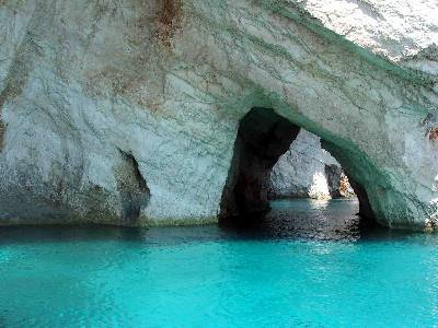 Tour boats leave from nearby ports such as Agios Nikolaos, and the small boats duck under the arches and into the caves along the rock. Orange coral adds color to the underwater vista. |