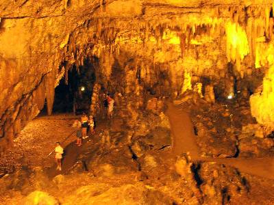 | The entrance to Drogarati Cave was created about 300 years ago by an earthquake, though the cave itself represents tens or hundreds of millions of years of creation. It takes a thousand years for one centimeter of stalactite to form. The cave is 60 meters (almost 200 feet) below the ground. Though it was bone dry outdoors, and had been for months, ground water dripped relentlessly from the ceiling. The air is so cool and the acoustics inside the cave are so fine that summer concerts are performed there. | |