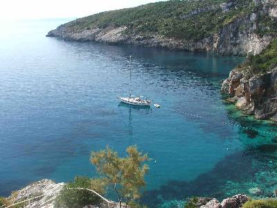 | Our first arrival to Greece in 2002 brought us to the islands of the Ionian Sea, but we didn't yet appreciate their lush greenery, postcard-perfect waters, or its many uncrowded nooks and crannies for anchoring and swimming during the hot days of summer. Here, Swept Away is anchored just under a lighthouse at the top of Zakynthos Island, and within dinghy distance from a personal exploration of the blue caves. | |