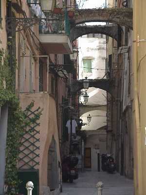 Frescoes and trompe l'oeil show up in the grandest of churches and palazzi, and often on ordinary houses as well. Historically, stone and marble masonry was not particularly expensive, so cost might not be the main reason for the amusing artwork. One alternative explanation offered is that people living on the narrow streets in the old towns wanted to offer architectural detail on the buildings without interfering with the scarce public space. It's common to see arches across the small streets, and occasionally the upper floors of the adjacent buildings will connect with rooms built on top of the arches. The arches undoubtedly provide some stability for the medieval houses, and they make the streets appear cozy and inviting. |