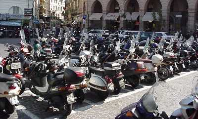 Combine the tiny passageways with the great weather and the high cost of fuel, and you'll conclude that motorbikes are a great way to get around in Liguria. This isn't the parking lot of a huge train station. It's just a square in the medium-sized town of San Remo on a normal day. |