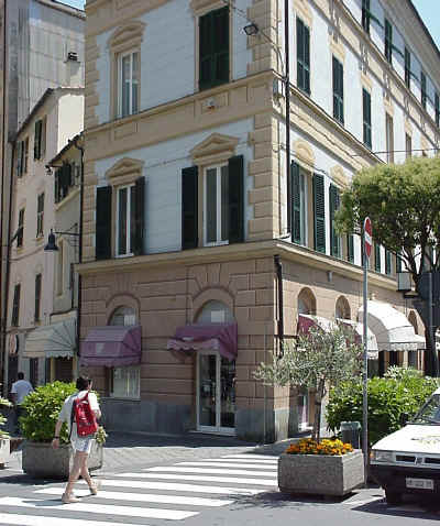 The architectural technique of trompe l'oeil (which means "fool the eye") is everywhere along the coast, even in the smallest towns. The building shown at right is in Savona. Only the three horizontal ledges just under the three rows of windows are real. The arches above the windows, the appearance of beige bricks, and the appearance of shadows are all painted onto the facade. This technique has also been common in some of the churches we've visited. We'll spend five minutes looking at a ceiling and say, "It's real", then come back later and see that the architectural details are trompe l'oeil. |
